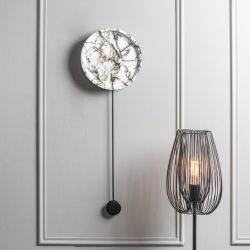 Realizzato in resina con quadrante ad effetto marmo in color bianco e pendolo in color nero. Dettagli delle lancette in color brunito.