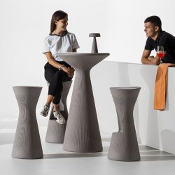 Tavolo alto in polietilene colore grigio argilla, materiale adatto all'utilizzo all'aria aperta. Le forme sinuose e la superficie rigata ricordano i materiali naturali.