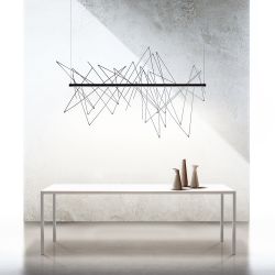 Graffiti è una lampada dal carattere forte, quasi una scultura da appendere al soffitto per ornare la tavola in sala da pranzo. Costituita da un corpo luminoso in alluminio verniciato color antracite, questa lampada ha un profilo magnetico su cui si possono appoggiare a piacere le bacchette in acciaio inox. Giocando con forme e intersezioni si crea di volta in volta un'opera unica e personalizzata. La luce emessa dalla lampada enfatizza i disegni creati con le bacchette.