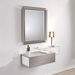 Due è una composizione da parete per l'ingresso che include un contenitore a cassetti, una mensola di vetro e uno specchio.