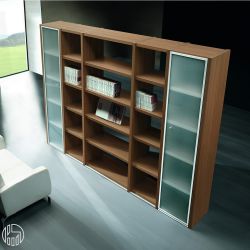 Questa composizione ha una larghezza totale di 282 cm, profondità 44 cm e altezza 215 cm, e prevede due vani di larghezza netta 43 cm con anta in vetro e schienale in tinta, due vani di larghezza netta 43 cm bifacciali e un vano centrale di larghezza netta 86 cm bifacciale.