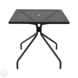 Tavolo quadrato da giardino in metallo con foro per ombrellone.