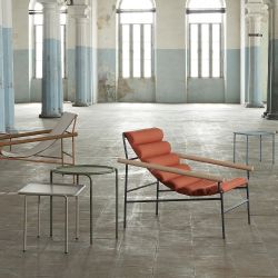 La sedia lounge Dress Code si ispira agli abiti sartoriali e gioca con gli abbinamenti di colore. La struttura è realizzata con struttura in acciaio verniciato. La seduta imbottitaè sagomata a onde e rivestita in tessuto con motivo trapuntato. I braccioli sono in legno di rovere naturale, diametro 4 cm.