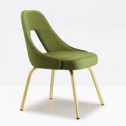 La struttura a quattro gambe è realizzata in acciaio ∅25 mm con finitura ottone satinato. Sedile e schienale sono in multistrato curvato interamente imbottito e rivestito in velluto o in similpelle. Diversi i colori disponibili.