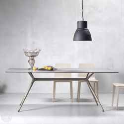 Tavolo di design rettangolare ideale per la cucina o la sala da pranzo. Gambe e traversa sono in acciaio, i supporti del piano in pressofusione di alluminio. La struttura verniciata è disponibile in diversi colori.