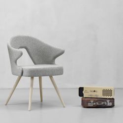 La poltroncina You accosta gambe in legno massello in finitura sbiancata ad una scocca imbottita. Il sedile e lo schienale sono realizzati con un'anima in multistrato curvato imbottita e rivestita in tessuto o similpelle.