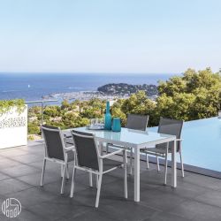 Presentato con struttura in alluminio verniciato bianco e piano in vetro temperato bianco, questo tavolo moderno è perfetto sia per l'arredo interno che per l'arredo esterno coperto.