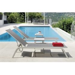 Linee arrotondate disegnano questo lettino in alluminio con seduta e schienale in textilene, fibra sintetica estremamente resistente agli agenti atmosferici ed ai raggi UV.