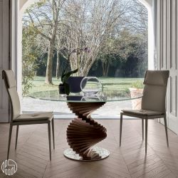 La struttura a spirale, unica nel suo genere, è realizzata in legno massello di noce Canaletto o rovere scuro, mentre il piano rotondo è in vetro trasparente, extrachiaro trasparente o grigio fumé trasparente (spessore 12 mm).