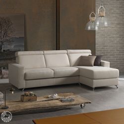 Linee moderne ed eleganti per questo divano con penisola, disponibile sia nella versione fissa sia nella versione divano letto. Oleandro-A è reso ancora più confortevole e accogliente dal poggiatesta regolabile.