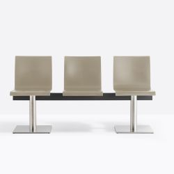 Sistema di sedute d'attesa a tre posti, con scocche di 12 mm in multistrato di legno impiallacciato disponibile nelle tinte rovere sbiancato, wengè e tinto nero, oppure con scocche in tecnopolimero nei colori bianco, sabbia, rosso o nero.